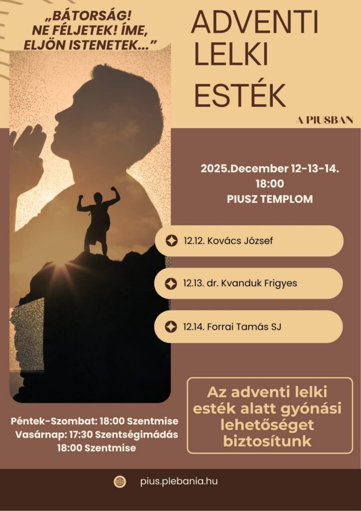 Mindenkit szeretettel várunk a Jézus Szíve (Piusz) templomban december 12. és 14. között a 18:00 órakor kezdődő szentmiséken tartandó lelki estékre. A lelki esték alatt lesz gyónási lehetőség, vasárnap pedig 17:30-tól szentségimádás előzi meg a szentmisét. A lelki esték mottója: „Bátorság! Ne féljetek! Íme, eljön Istenetek…”